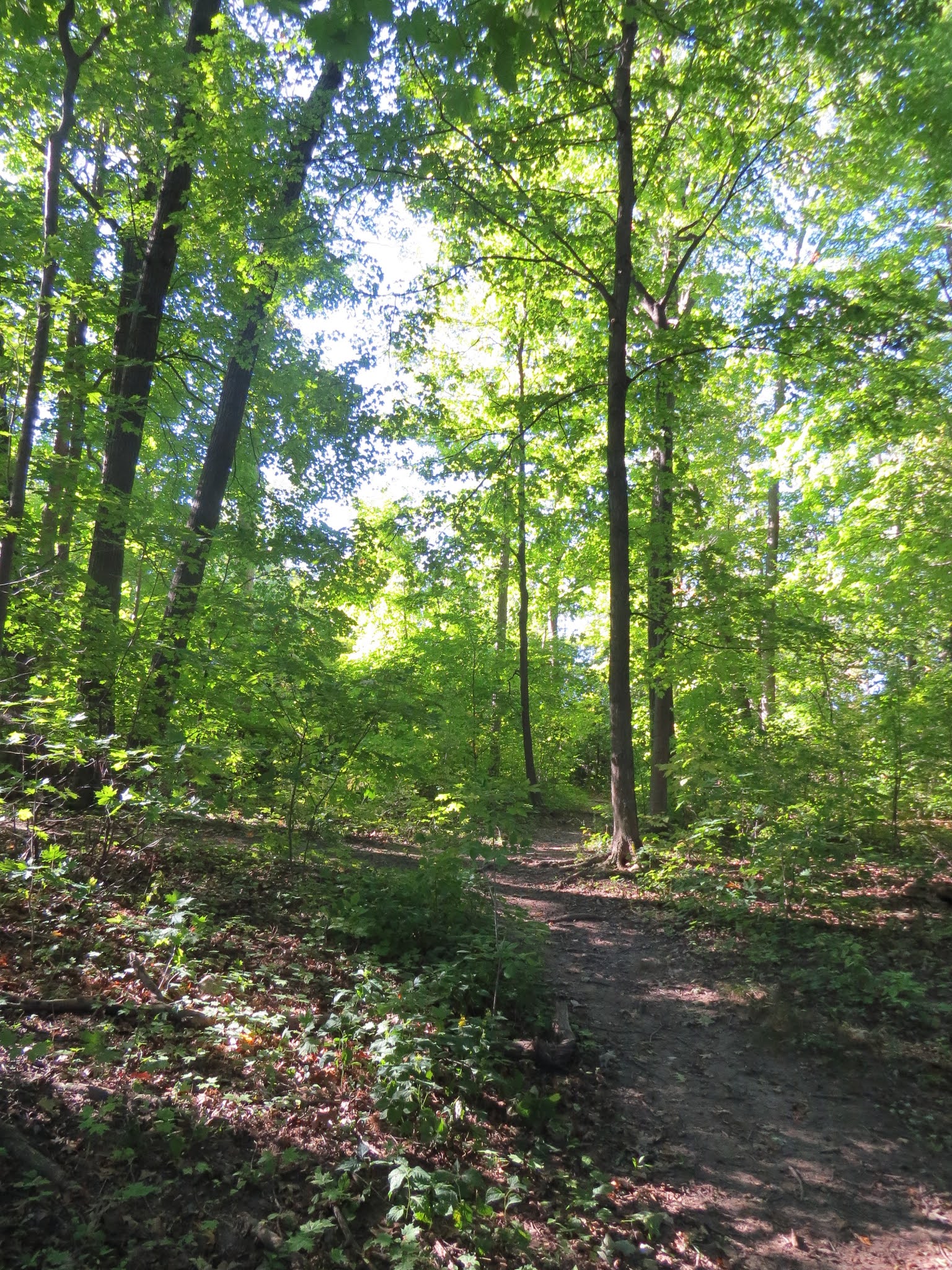 Navigating through the woods the trail soon traced in a narrow green corridor between two neighbourhoods. Unfortunately, over the years, a great deal of household rubbish and trash has been tossed behind many of these houses littering the beauty of this stretch of the trail. The sound of cars on the nearby roadway, lawnmowers in yards, radios on porches, and the sheer number of people hiking reminded us that we were now in town and no longer in the wilds or forest.